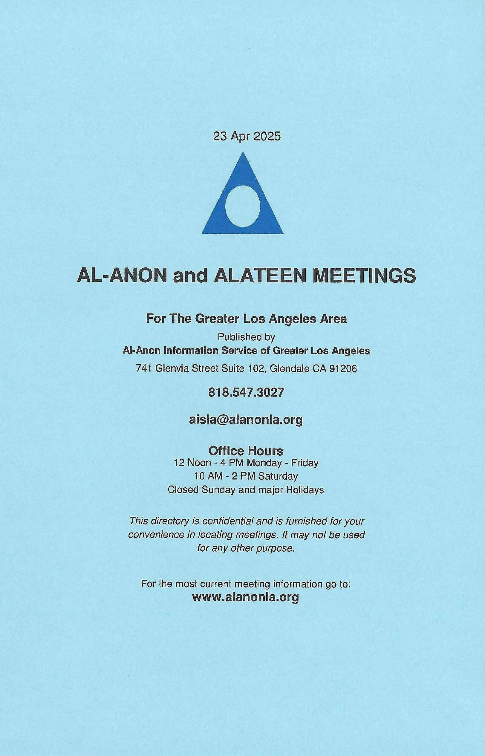 Al-Anon and Alateen Meeting Directory of Greater Los Angeles. This directory is confidential and is furnished for your convenience in locating meetings. It may not be used for any other purpose. Includes both Spanish and English meetings. Softcover, 8.5 x 5.5. 21 pgs.