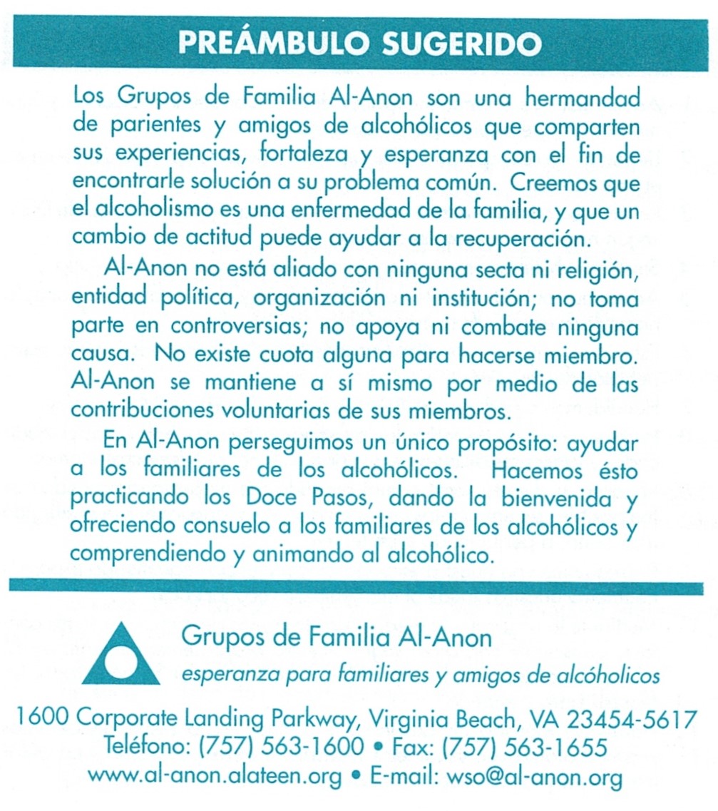 Tarjeta de bolsillo con el Preámbulo, los Doce Pasos, las Doce Tradiciones, los Doce Conceptos de Servicio, las Garantías generales de Al‑Anon y la Oración de la Serenidad.